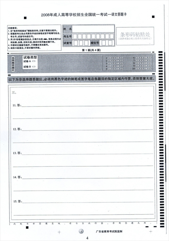 4、附08年成人高考语文答题卡样式: